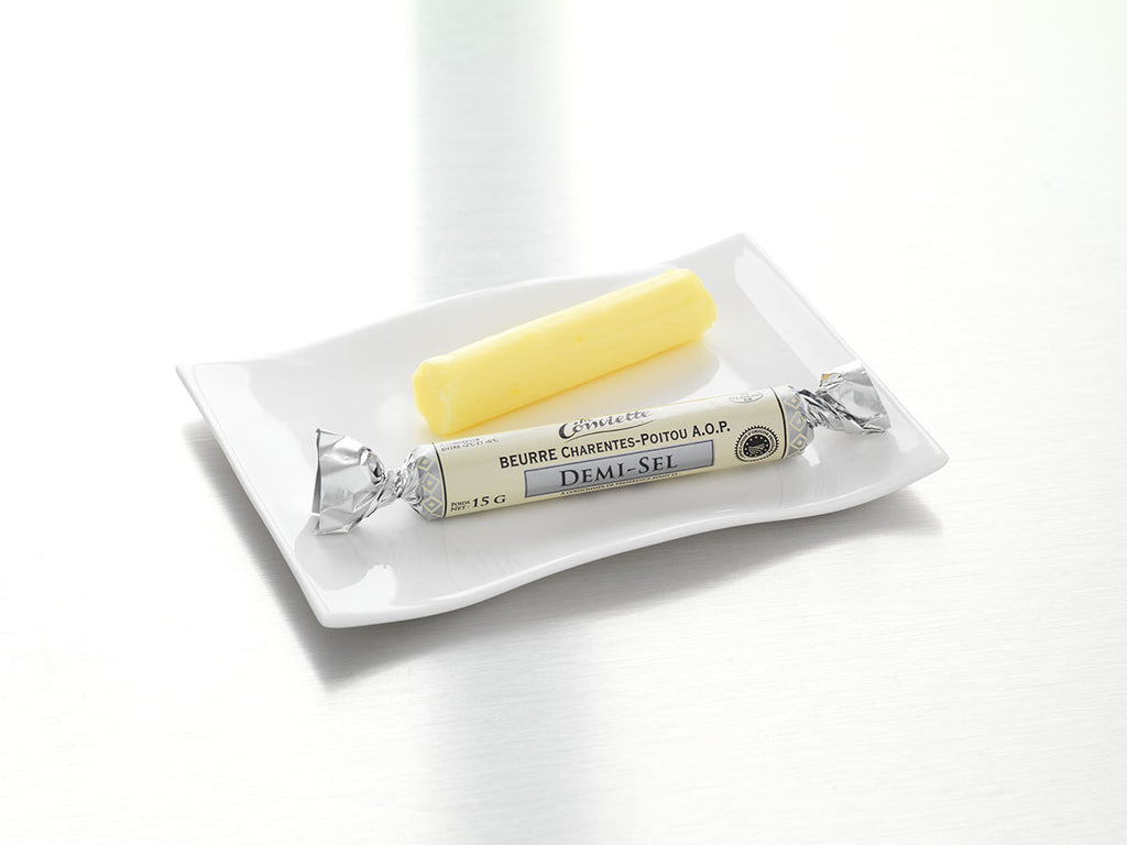 These premium 15-gram salted, individually-wrapped, "Conviette" butter rolls are perfect for restaurants, lunch counters, or any food-service application that requires an elevated, delicious, and portable butter solution.