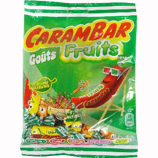 Very popular in France, Carambar is a chewy baton-shaped candy in different fruit flavors. This bag contains: Strawberry, Raspberry, Orange and Lemon flavored candy
