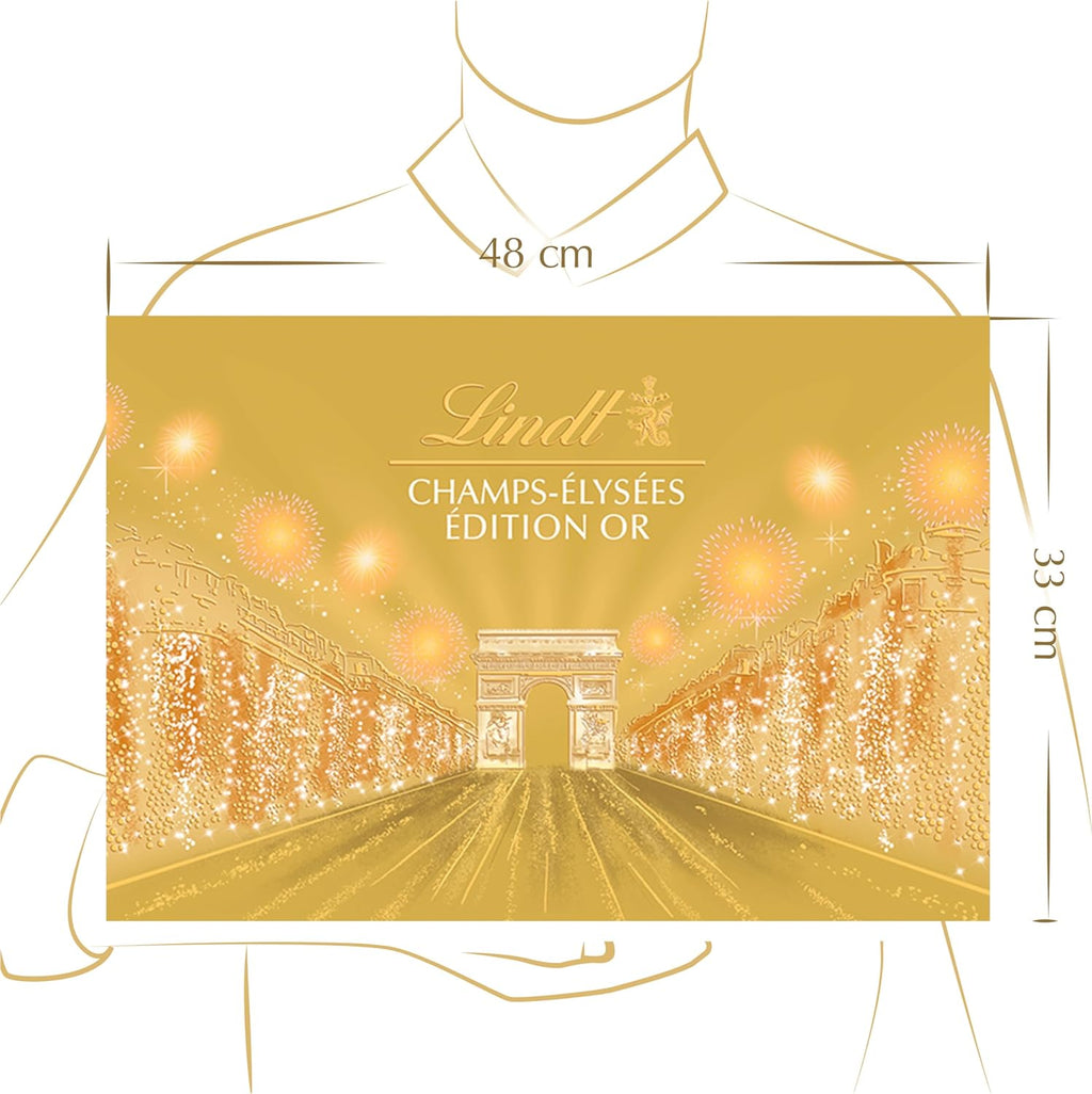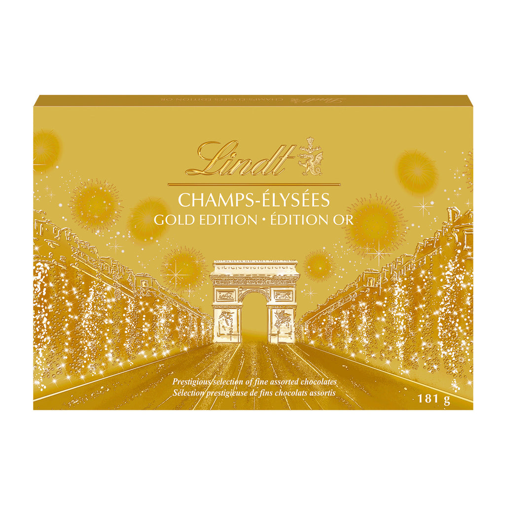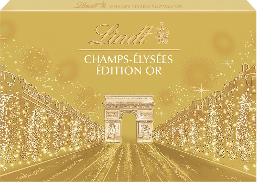 Lindt Champs-Elysées Or, c'est le plus pétillant des Assortiments pour Noël: un écrin doré, une recette de chocolat au sucre pétillant, pour des sensations inédites et pleines de surprises et un assortiment de fins chocolats au lait, noir et blanc.