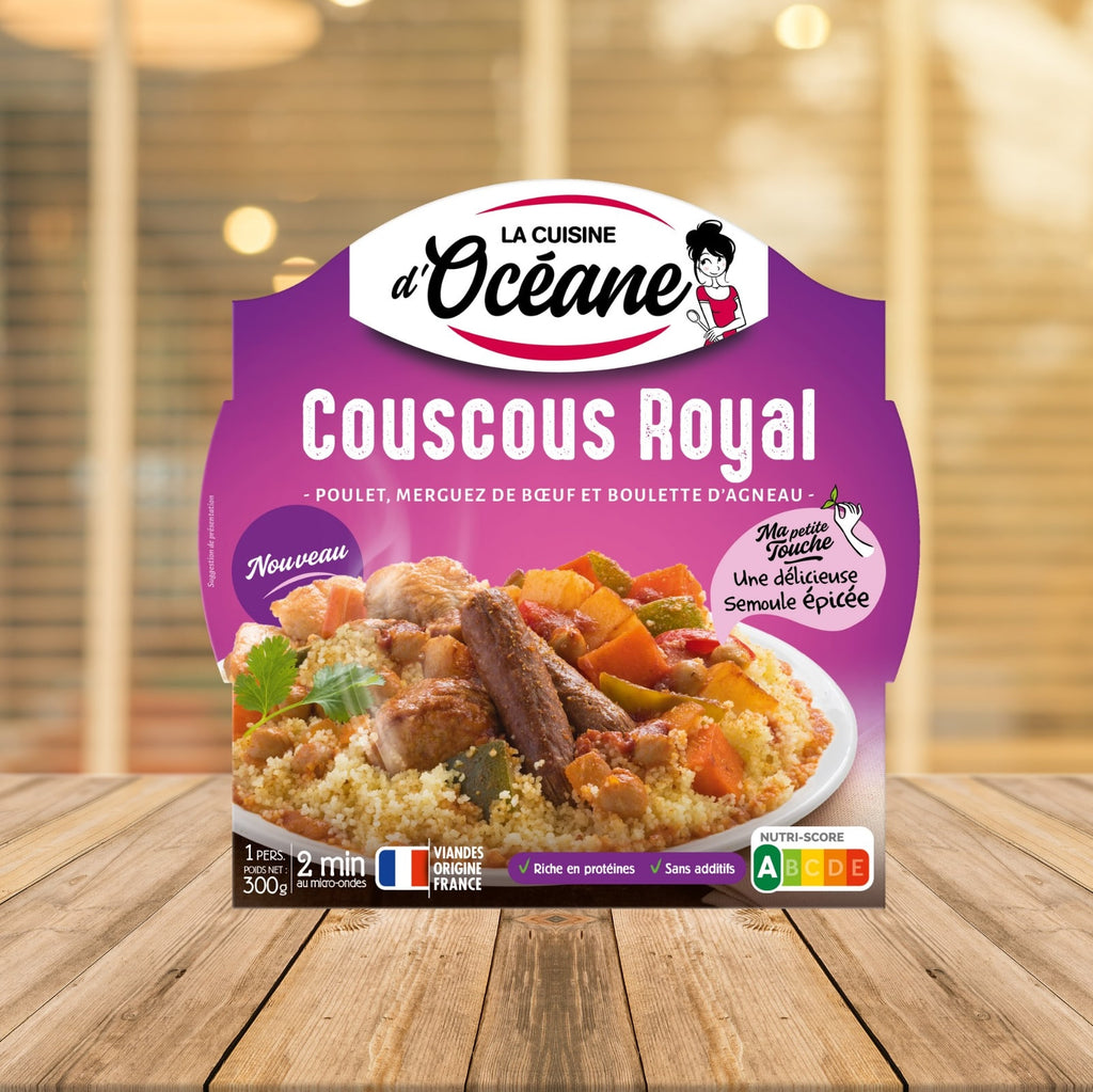 Semoule de blé dur précuite 30% (eau, semoule de blé dur, huile de colza, sel), poulet 15% (origine : France), eau, merguez 10% (viande de bœuf (origine : France), gras de bœuf, épices et plantes aromatiques, sel, dextrose, arômes naturels), boulette d’agneau 6,6% (viande d’agneau (origine France), protéines de soja réhydratées, sel, arômes, plantes aromatiques), carottes 4.6%, courgettes 4,6%, poivrons rouges et verts 4%, oignons, double concentrée de tomate, pois chiche 3%, navet 2,6%, farine de blé, sel, cumin, coriandre, curcuma, piment fort.