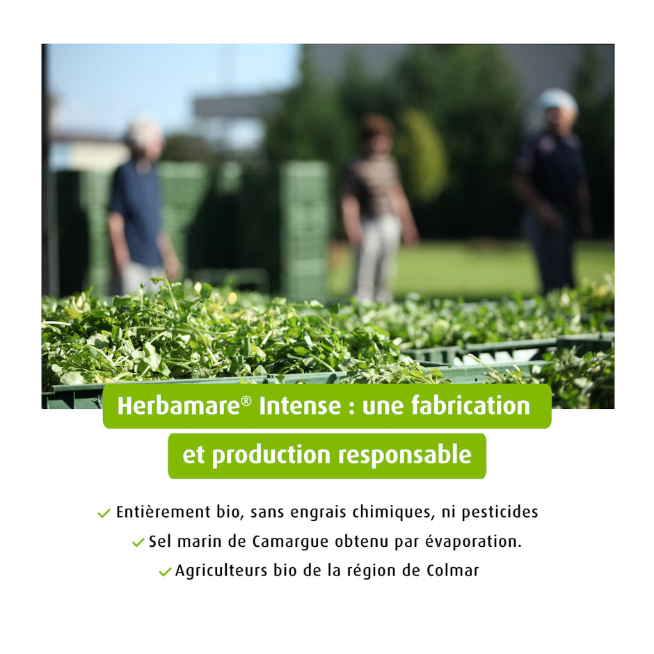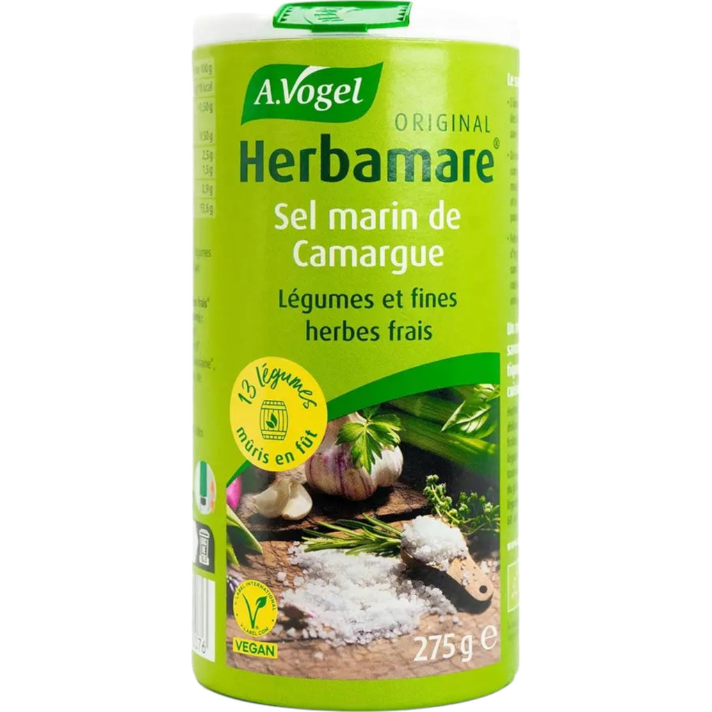 Herbamare, c'est le mélange unique du sel marin de Camargue et de 13 plantes aromatiques et légumes frais. Dès la récolte, les plantes et légumes frais sont immédiatement mélangés au sel marin.