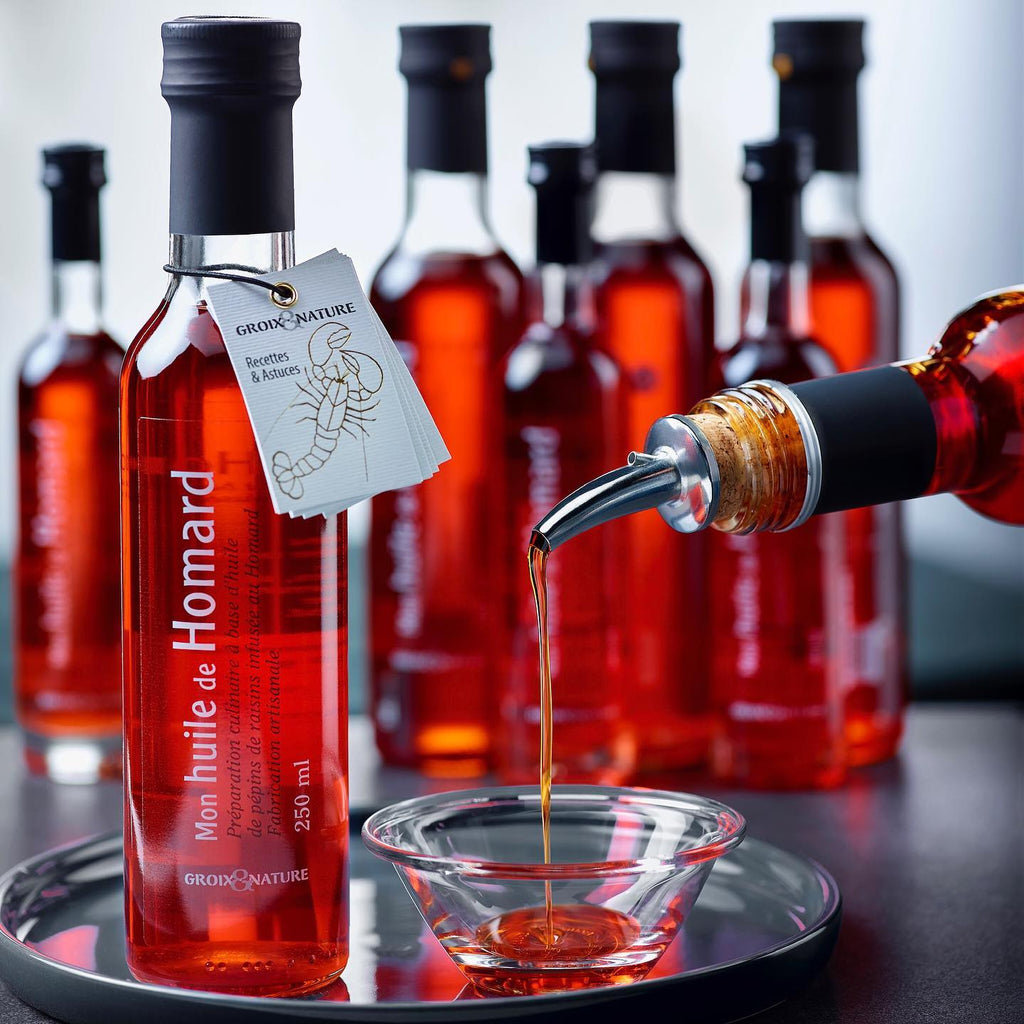 Groix & Nature lobster oil sublimates your culinary preparations to perfection. Unique, it is made from blue lobster, grape seed oil and herbs. It sublimes the taste of your preparations and gives a colorful, original and creative touch to your dishes. It lends itself to many uses: tagliatelle with seafood, salads, carpaccios of St Jacques, fillets of raw or cooked fish, sushi or tartar.