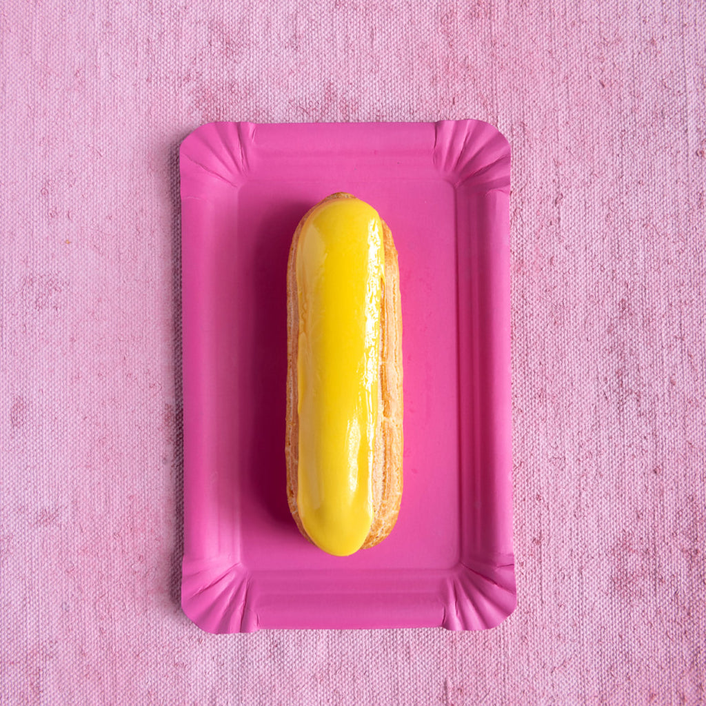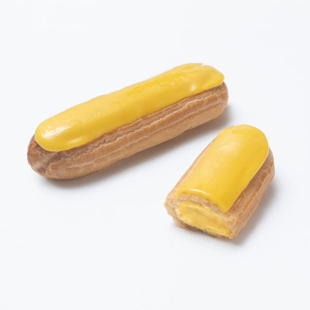 Choux pastry filled with fruity mango and passion fruit cream and covered with bright yellow mango glaze. Ideal for an afternoon coffee speciality or as an attractive dessert variation.