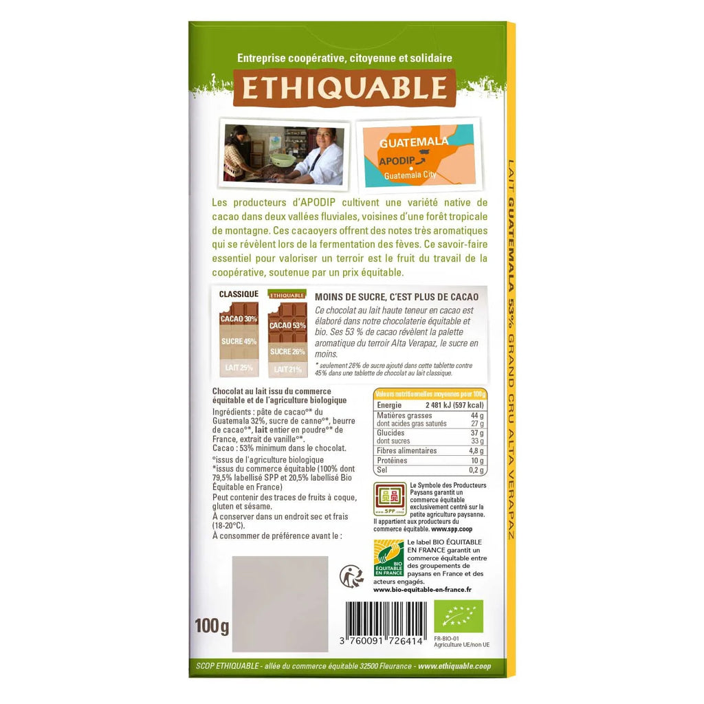 Milk chocolate 53% Guatemala Grand Cru Alta Verapaz A milk chocolate with a high cocoa content means less sugar in the bar. Guatemalan cocoa reveals delicious notes of caramel and fresh butter and, even more surprisingly, nuances of licorice, roasted coffee and red fruits.