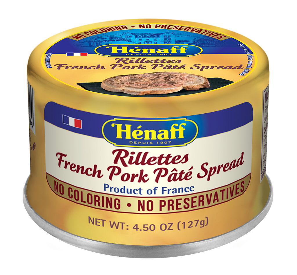 A top-quality product. The main ingredient of these rillettes, pure pork, is of guaranteed French origin. The same care and attention is given to the whole recipe, from the choice of pork up to its preparation and cooking. Hénaff prefers long, slow cooking that gives the meat sufficient time to become deliciously succulent and confit. The result is a uniquely smooth taste experience. Free of colorings and preservatives.