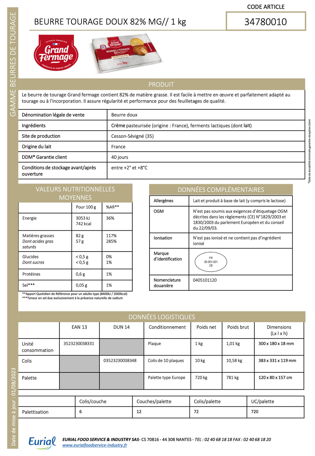 Le beurre de tourage Grand fermage contient 82% de matière grasse. Il est facile à mettre en œuvre et parfaitement adapté au tourage ou à l’incorporation.