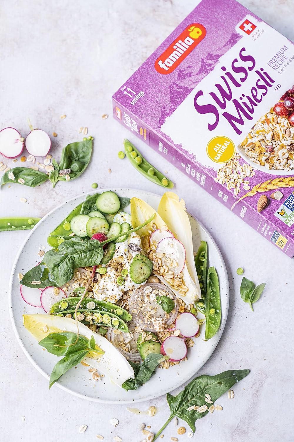 Bio-Familia Swiss Müesli Premium Recipe is a unique blend of the finest whole-grain rolled oats, spelt, barley, and cornflakes. It provides lasting satiety and requires no soaking. We've added select fruit, nuts, and seeds to provide you with long-lasting energy. With no sugar added, Bio-Familia Swiss Müesli Premium Recipe is the perfect guilt-free breakfast or balanced meal.