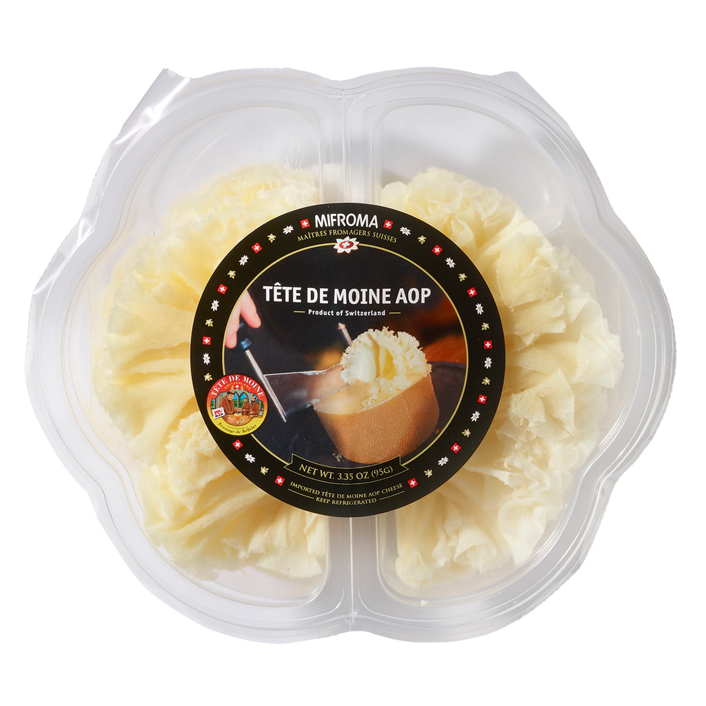 Tête de Moine AOP is a strong, semi-hard cheese with a robust aroma and texture. Its full flavor is due to natural untreated milk from dairy cattle that have summer grazed on the Jura mountain pastures.