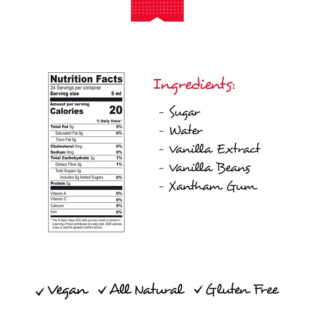 Ingredients: Sugar, Water, Vanilla Extract, Vanilla Beans, Xanthan Gum